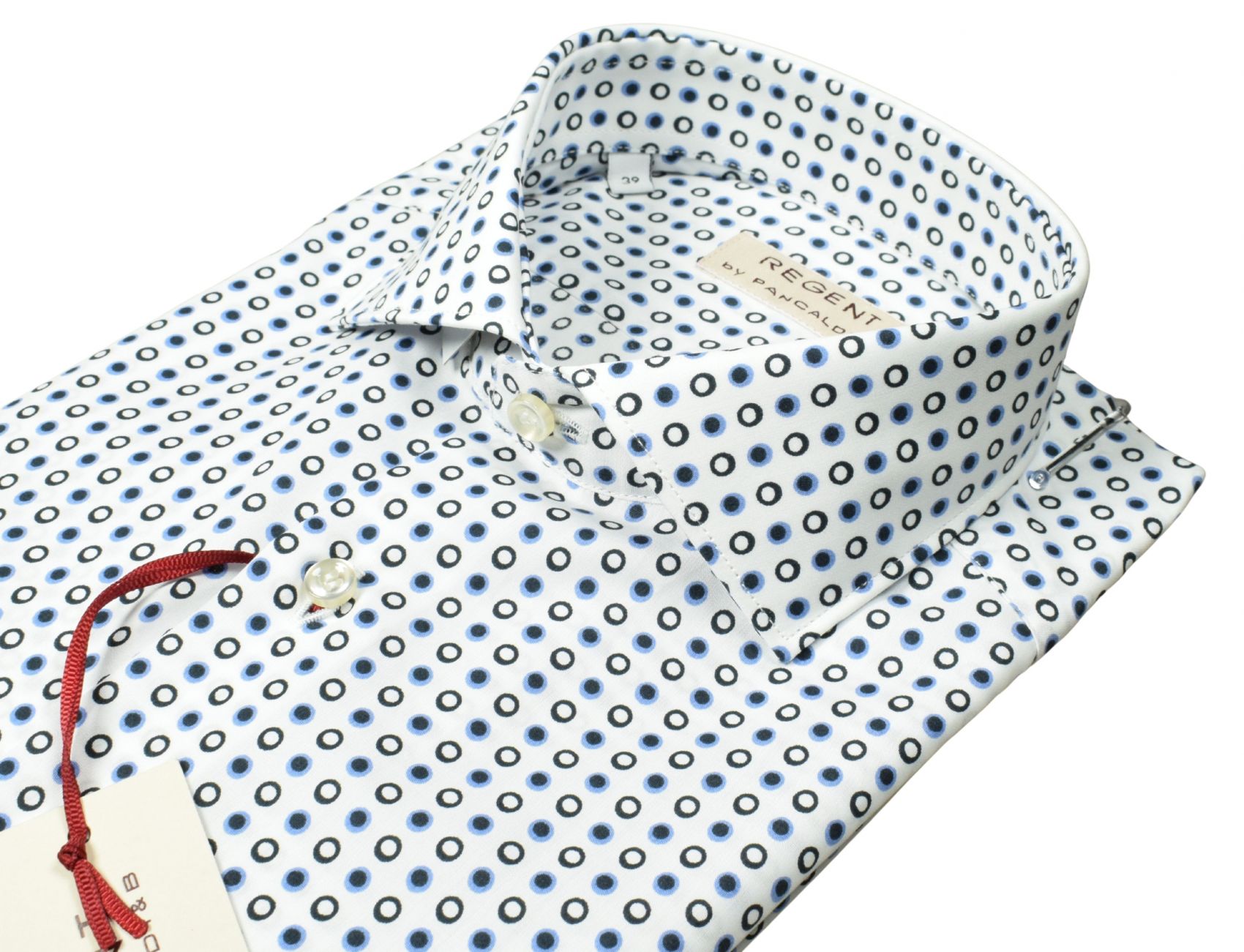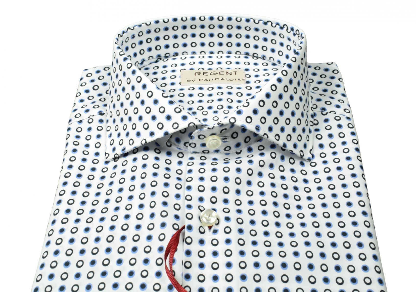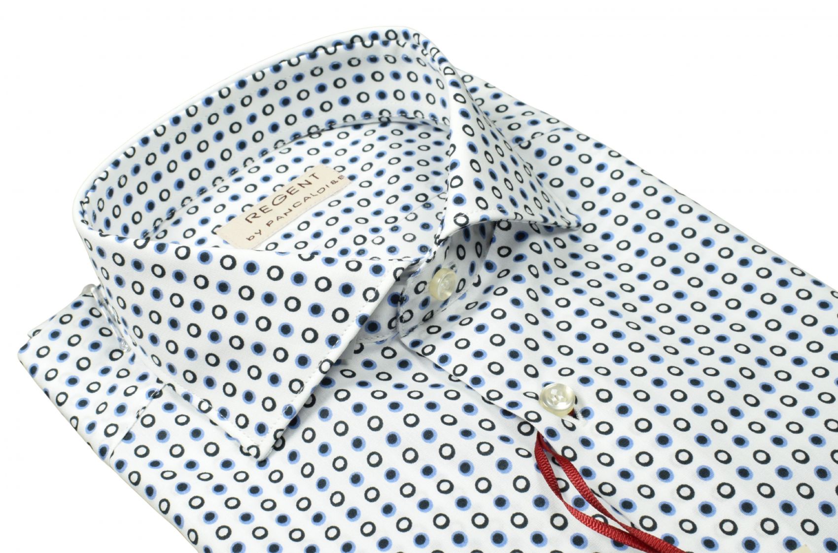 Questa camicia Regent by Pancaldi unisce stile contemporaneo e qualità sartoriale. Realizzata in 100% cotone con una stampa micro‑geometrica nei toni del blu e del nero, offre un aspetto ricercato e un tocco di originalità senza rinunciare all’eleganza.