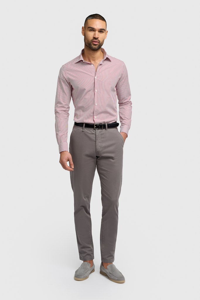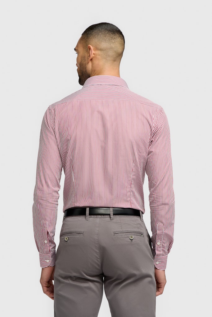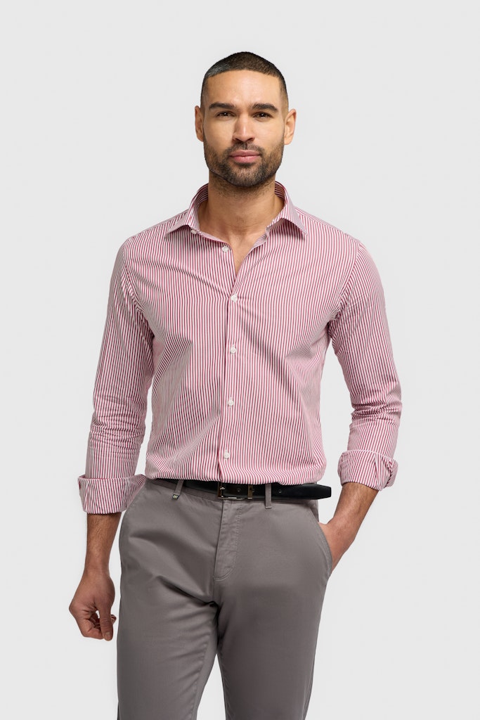 Questa camicia sartoriale a righe rosse è realizzata in Italia con tessuti di alta qualità, pensata per chi desidera uno stile raffinato e impeccabile in ogni occasione.