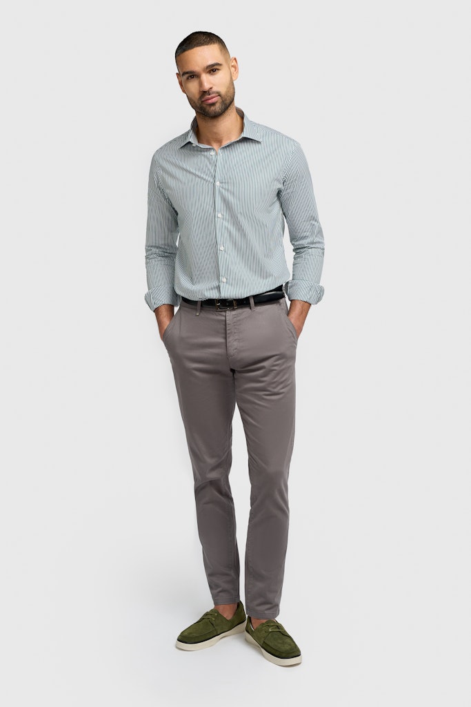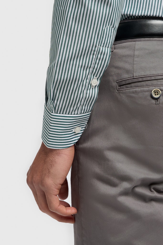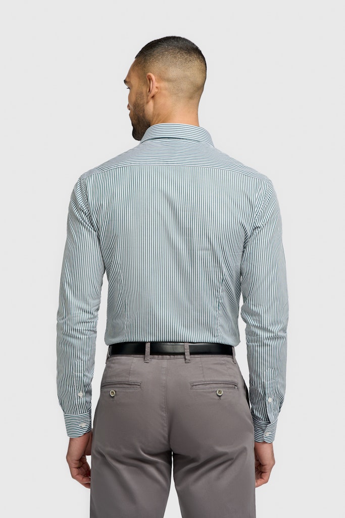 Questa camicia sartoriale a righe verde è realizzata in Italia con tessuti di alta qualità, pensata per chi desidera uno stile raffinato e impeccabile in ogni occasione.