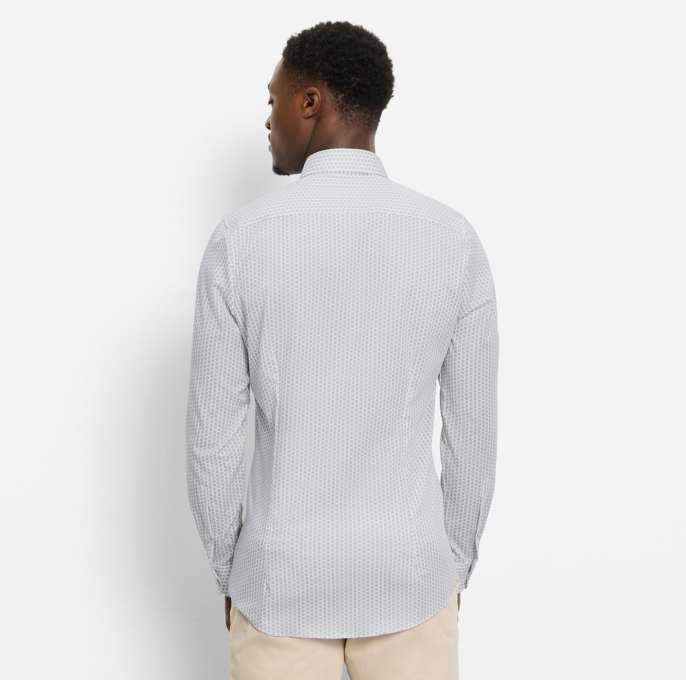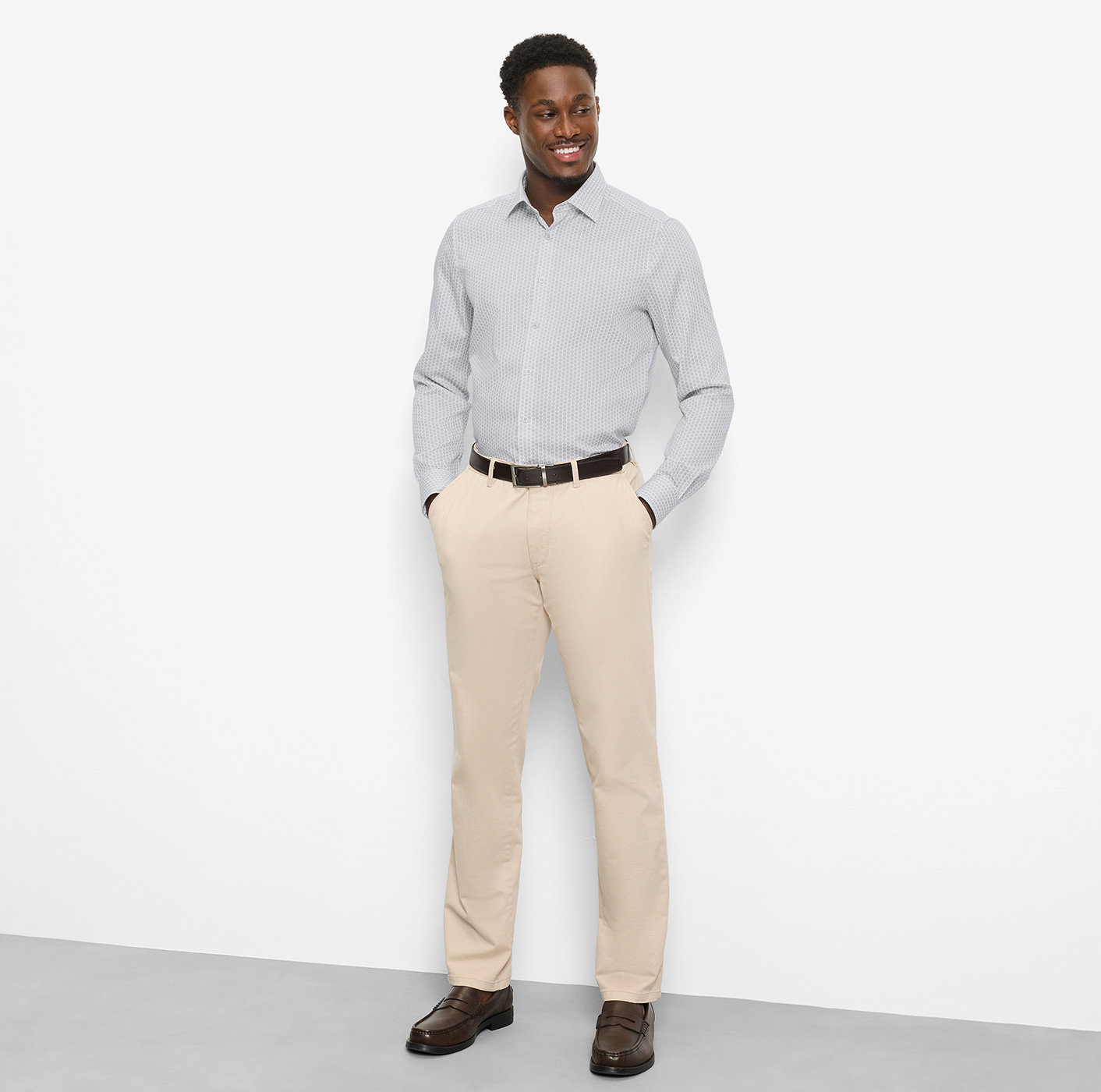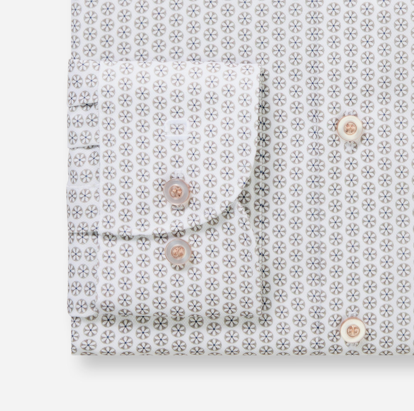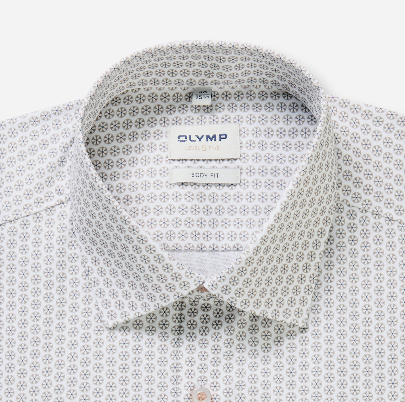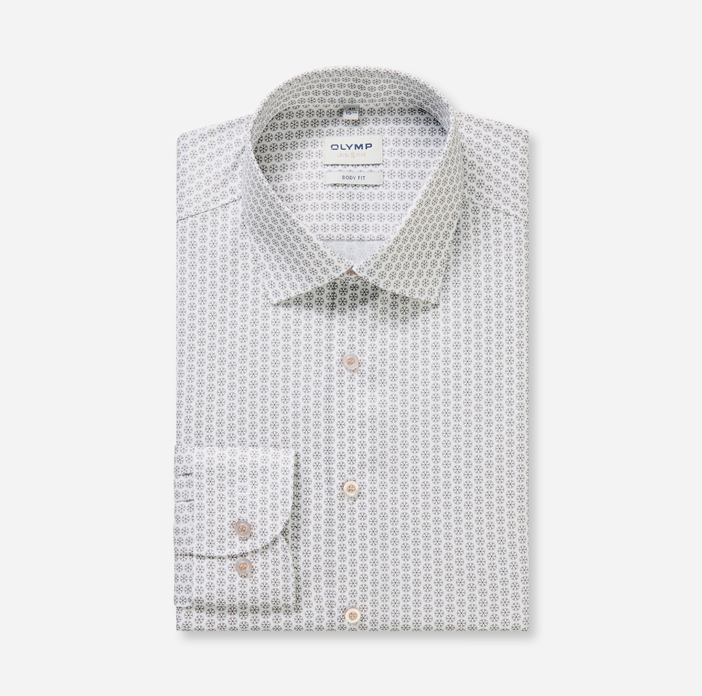 Camicia OLYMP Level Five Body Fit in bianco e beige con micro‑motivo geometrico. Taglio aderente, colletto classico e stile business contemporaneo. Ideale per l’uomo che cerca eleganza e comfort in ogni dettaglio.