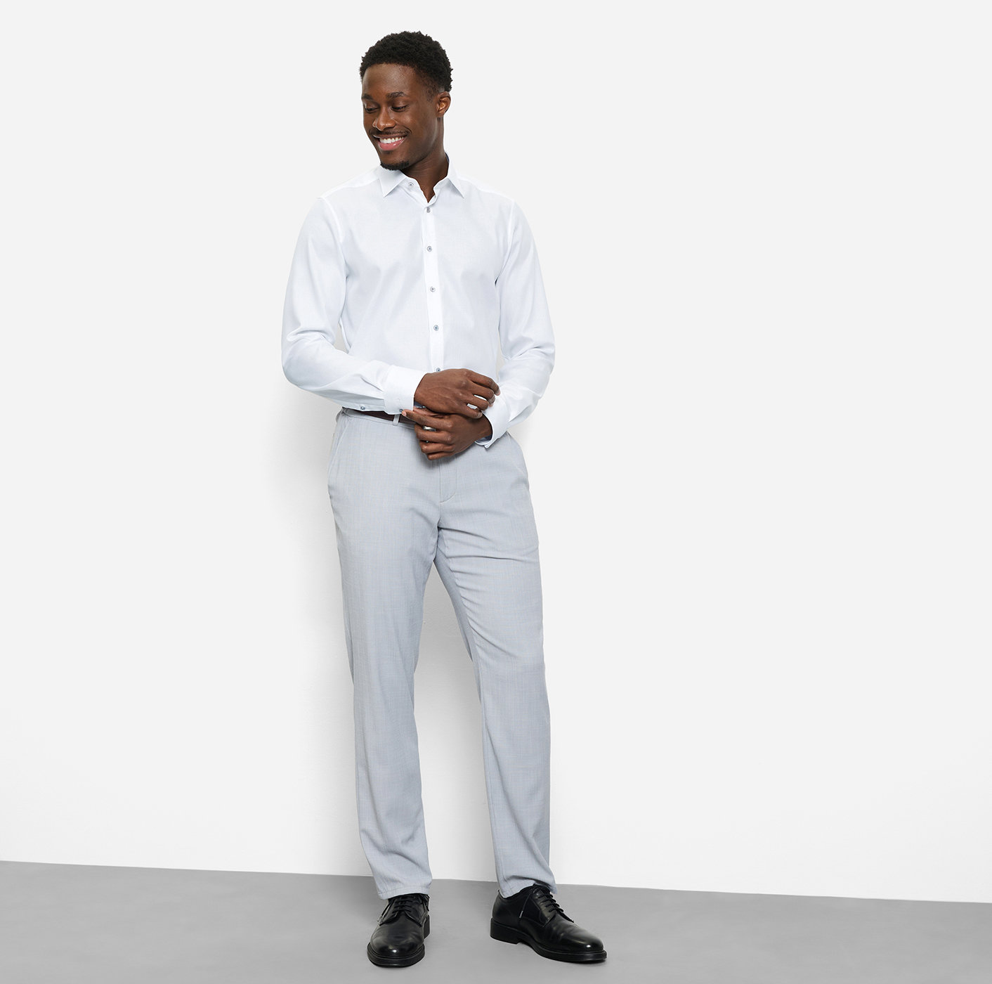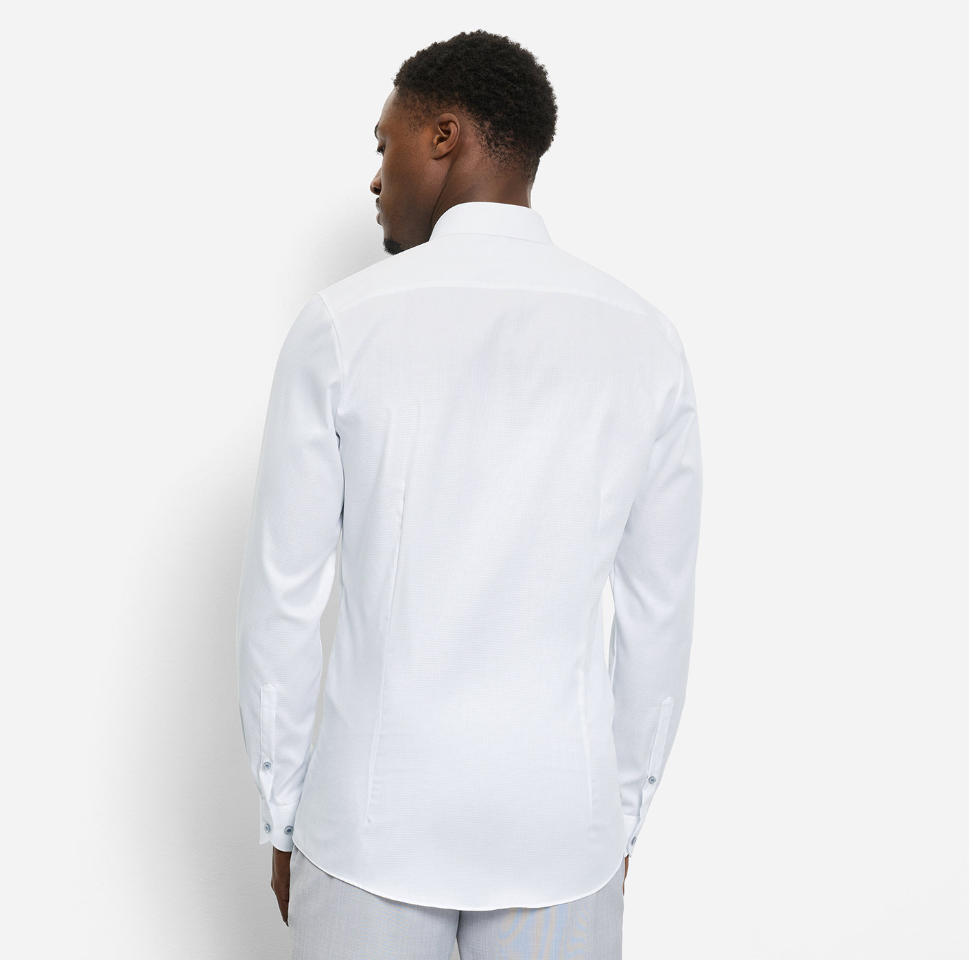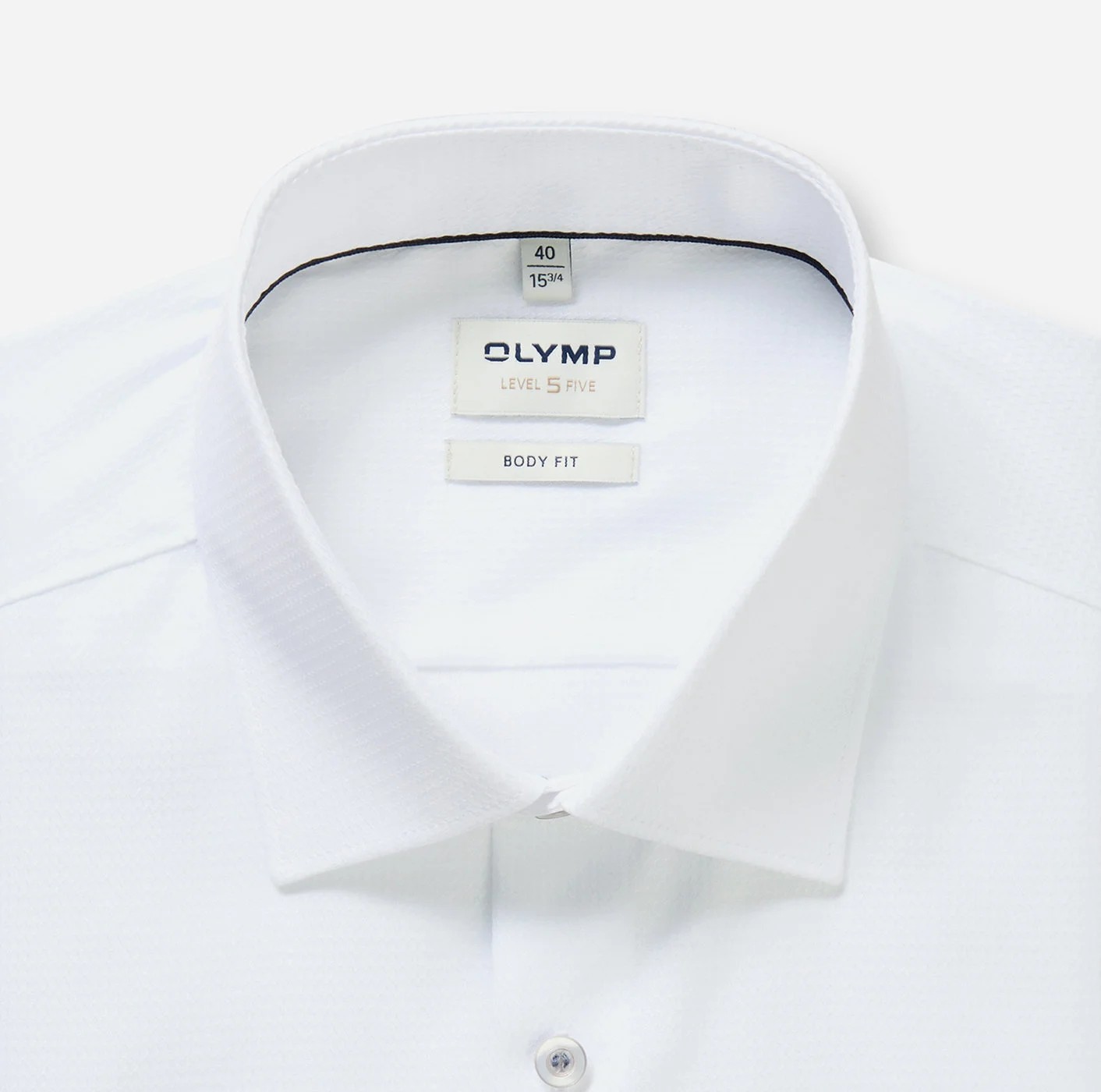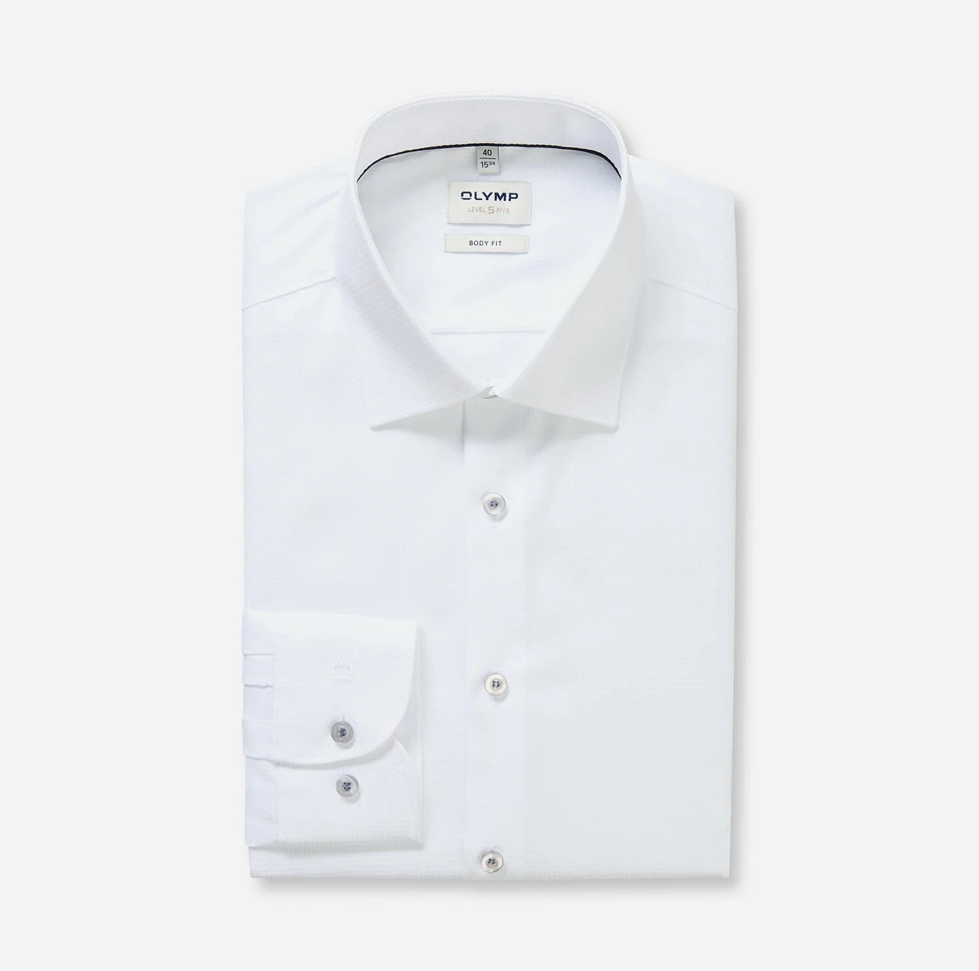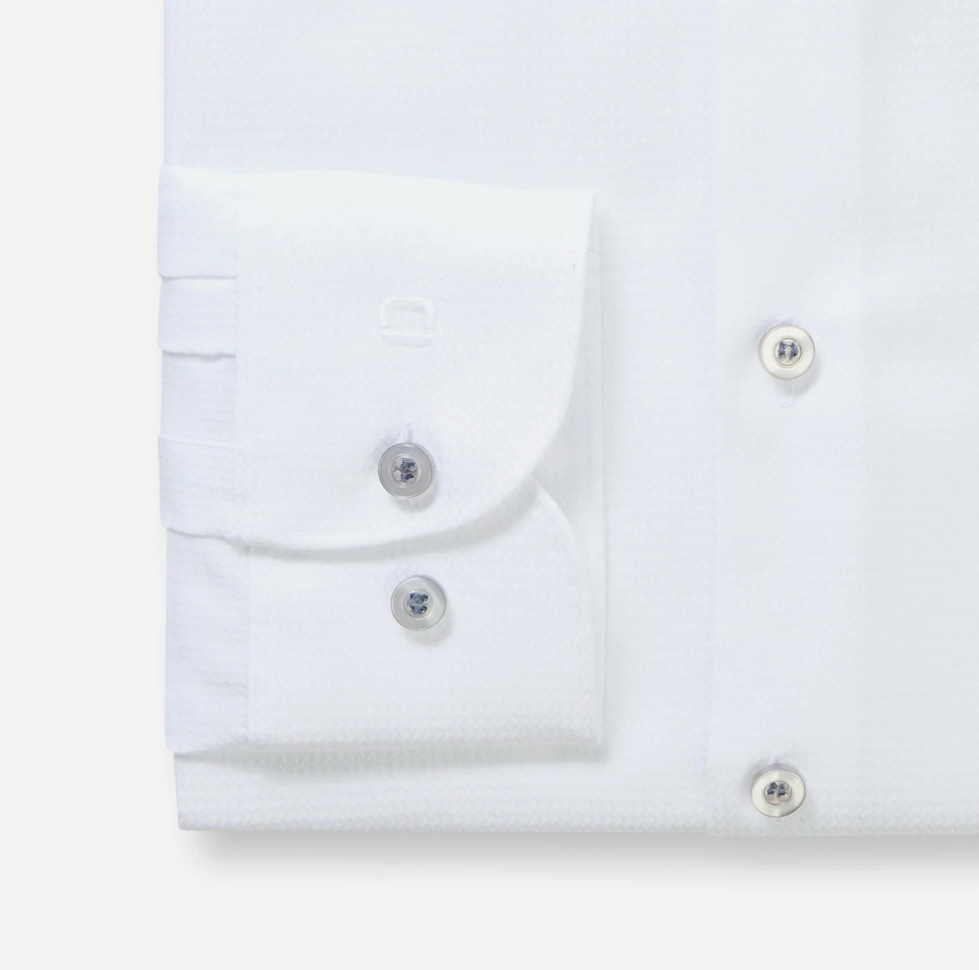 Camicia OLYMP Level Five Body Fit in bianco con micro‑motivo geometrico. Tessuto confortevole, linea slim e stile moderno per un look curato in ogni occasione.