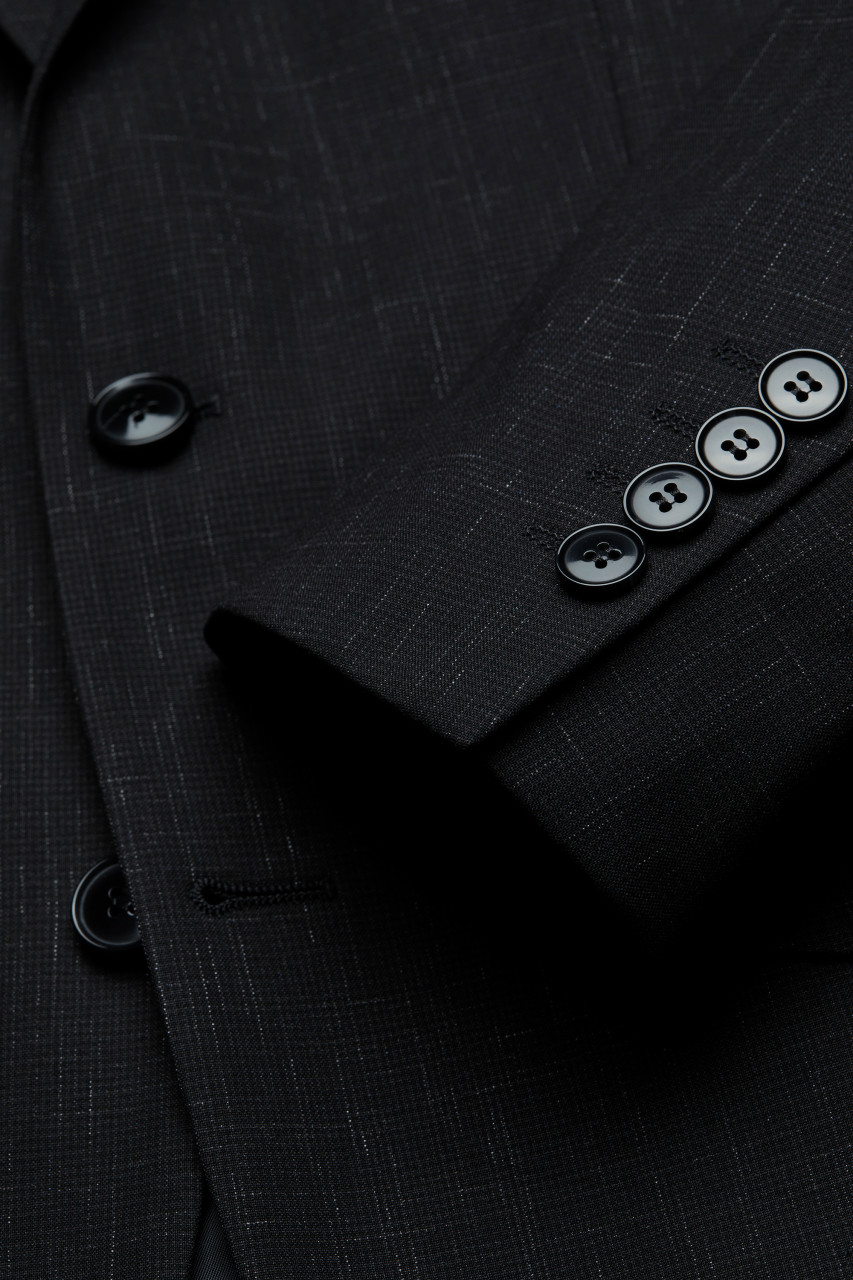 MODEL   Single-breasted jacket with two buttons, side vents, lined, slim fit with three inner pockets.