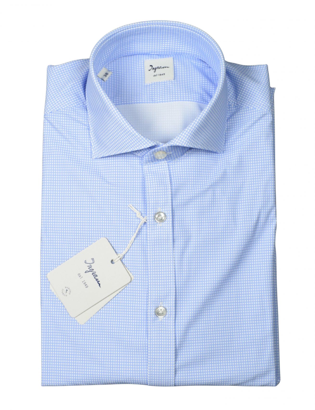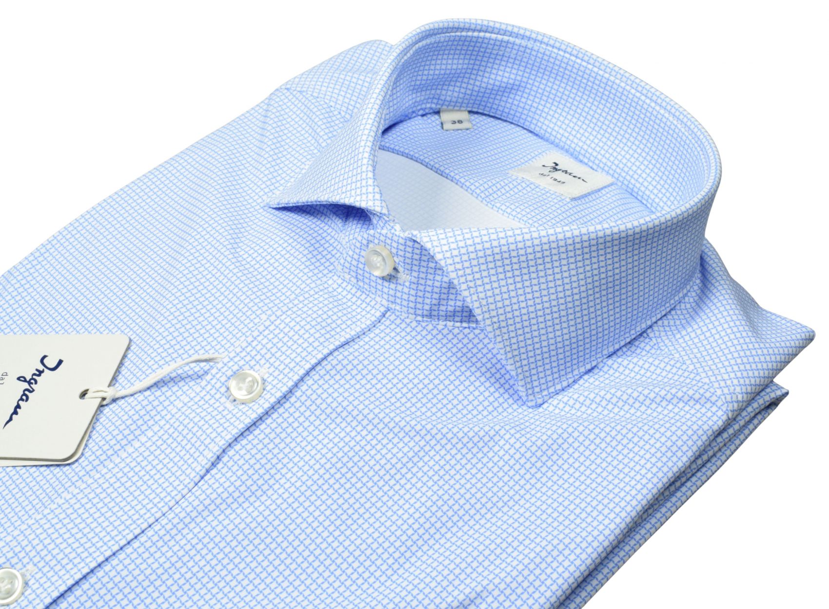 The subtle light‑blue micro pattern adds a modern and sophisticated touch, making it ideal for office wear, daily commitments and travel. The slim fit enhances the silhouette without compromising comfort, while the french collar ensures versatility with jackets, blazers or more casual looks.