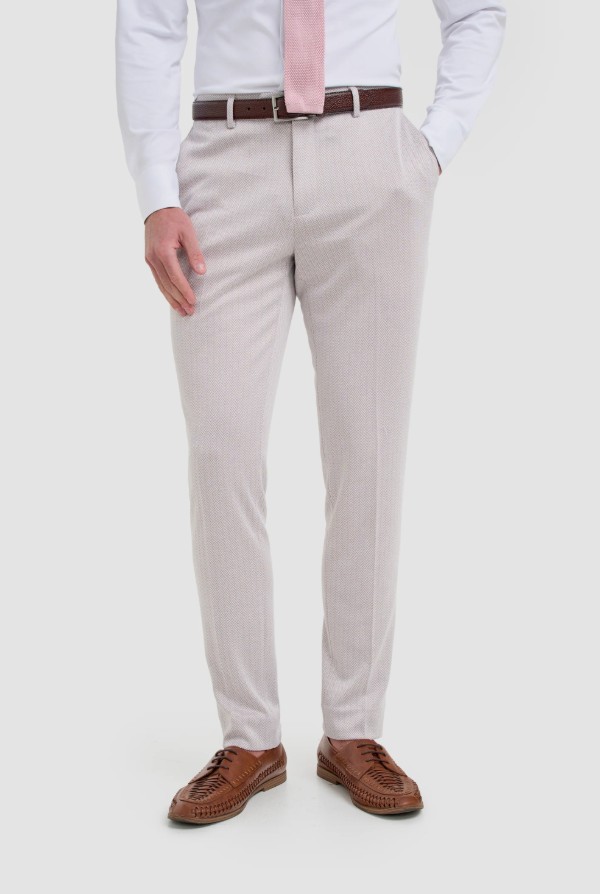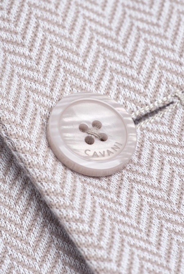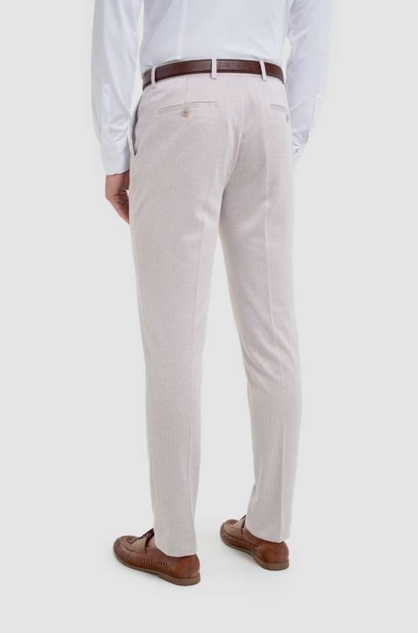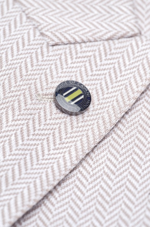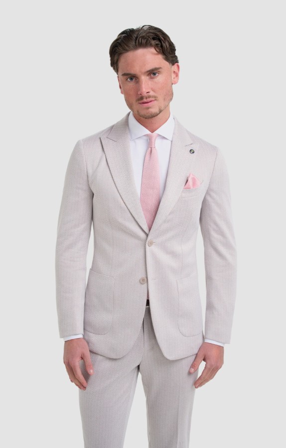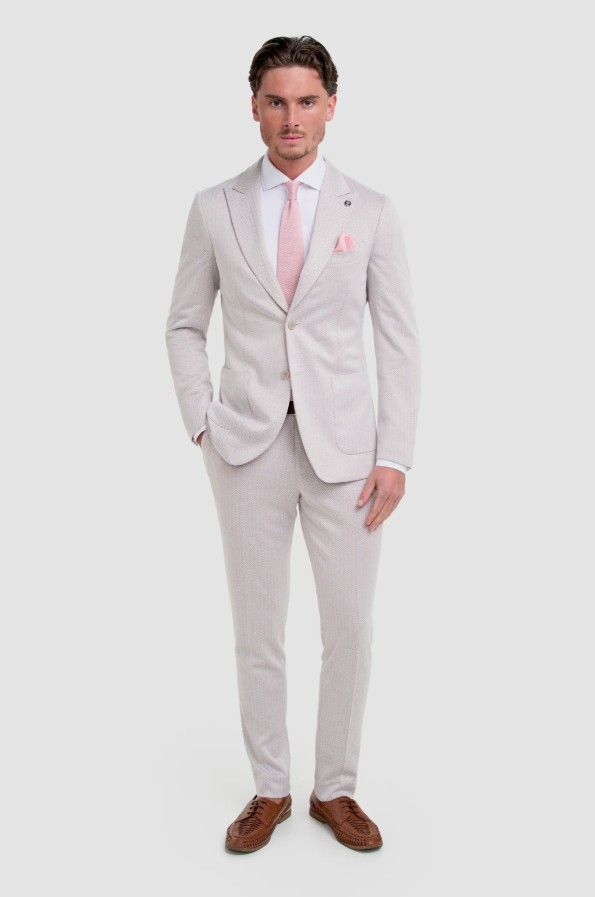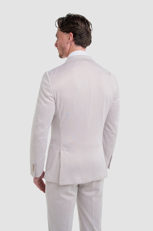Light beige suit with a contemporary and refined style, ideal for formal ceremonies or smart casual occasions. The jacket features peak lapels and semi-lined patch pockets, made from bi-stretch jersey fabric with a herringbone pattern.