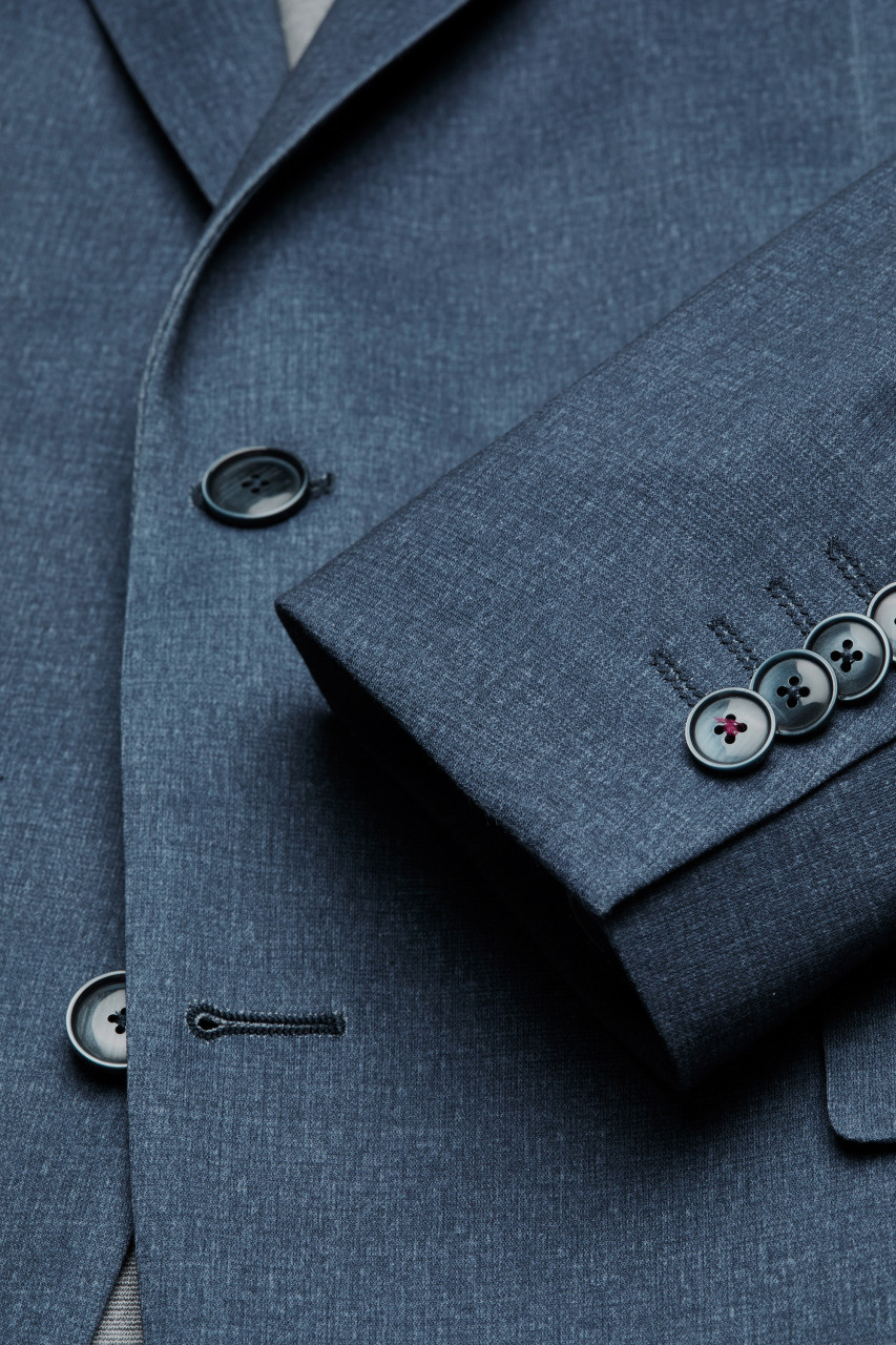 Two-button single-breasted jacket and welt pockets, side and semi-lined slits, amf stitching on the chest.