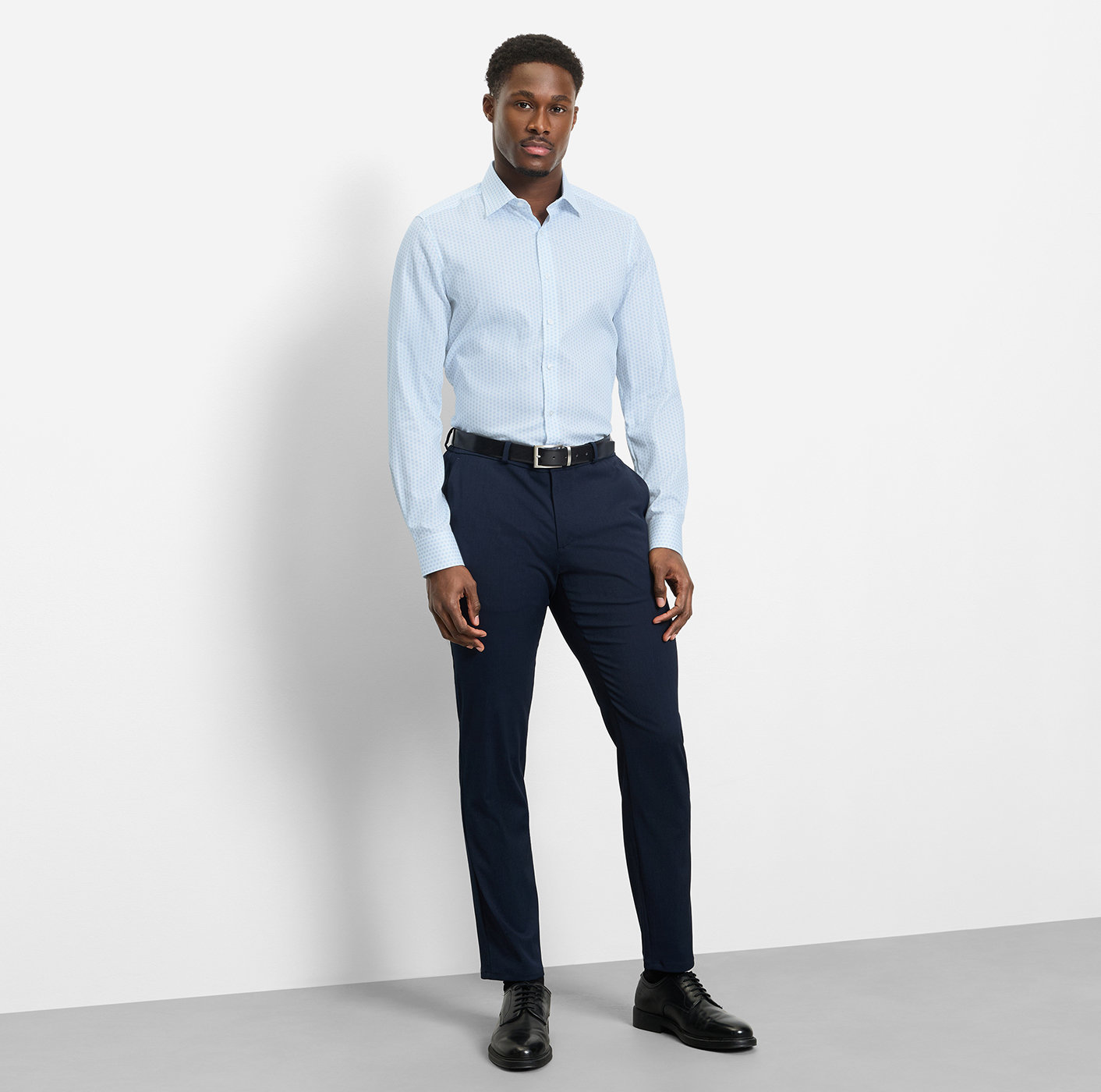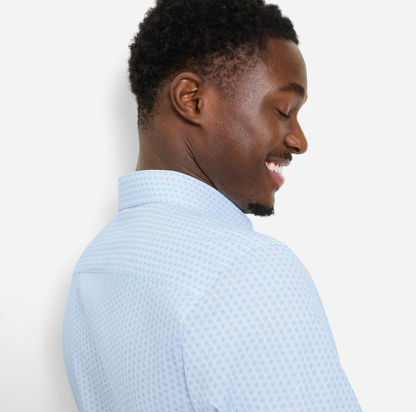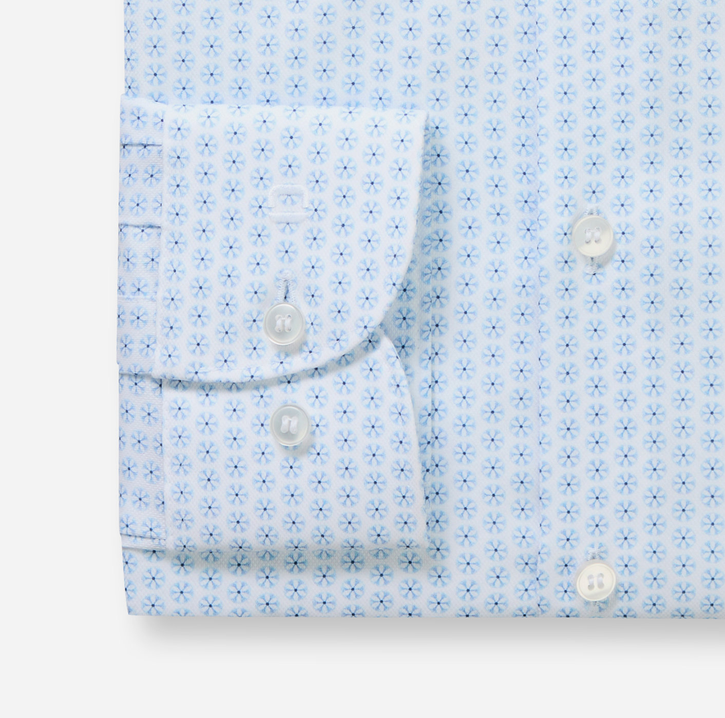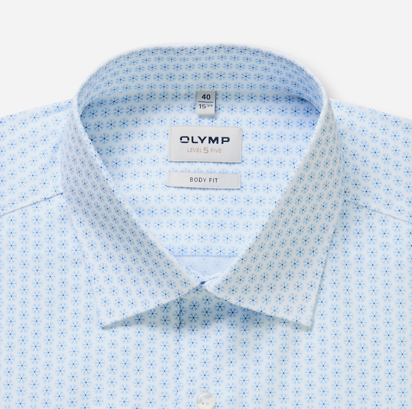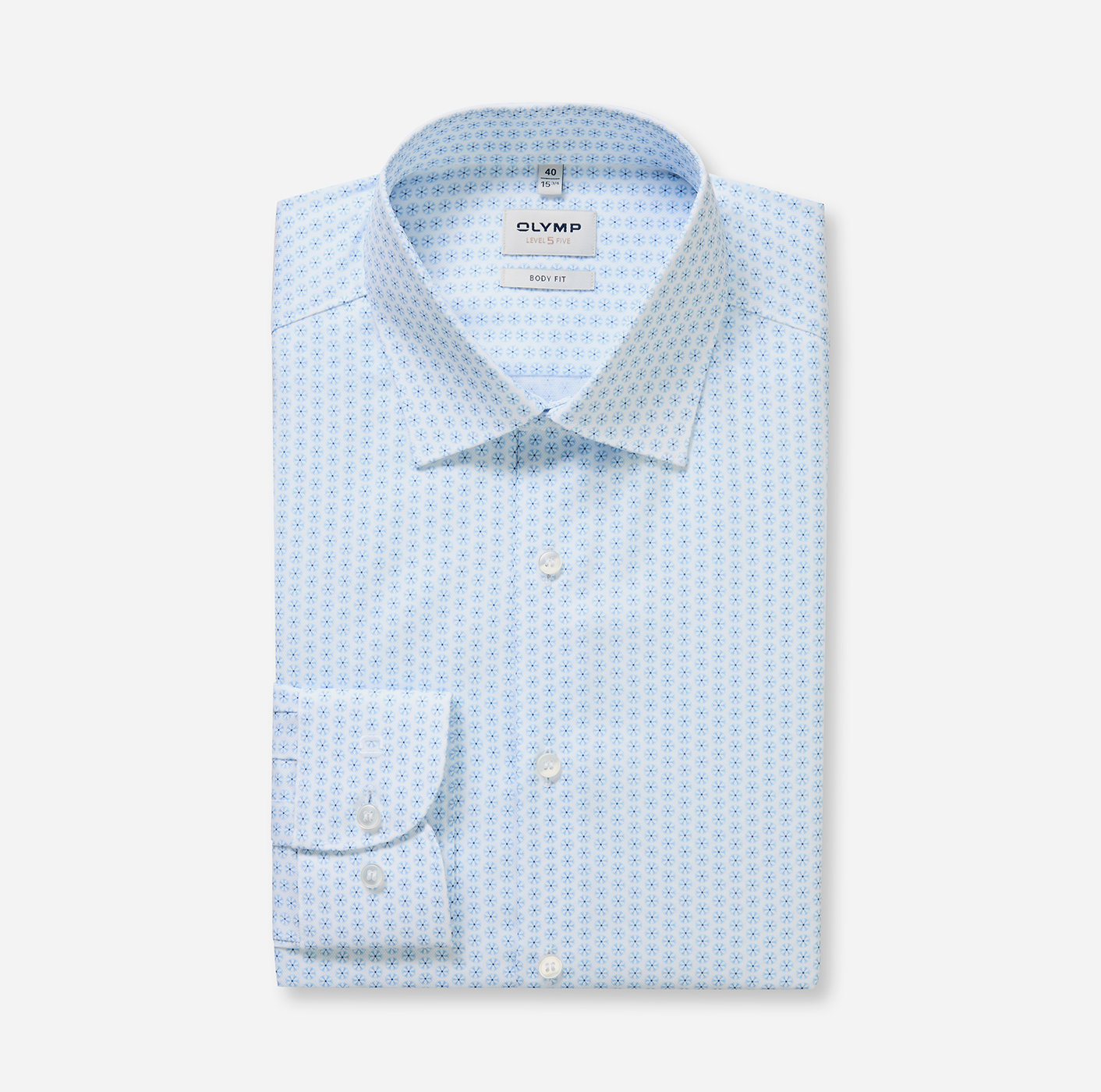 MODEL   Contemporary elegance and impeccable comfort come together in this OLYMP Level Five shirt. Made from pure cotton with stretch technology, it offers a body-fit silhouette that enhances your figure without compromising freedom of movement. The micro-printed blue pattern on a light blue background adds a distinctive and sophisticated touch, perfect for the man who pays attention to every detail of his style.