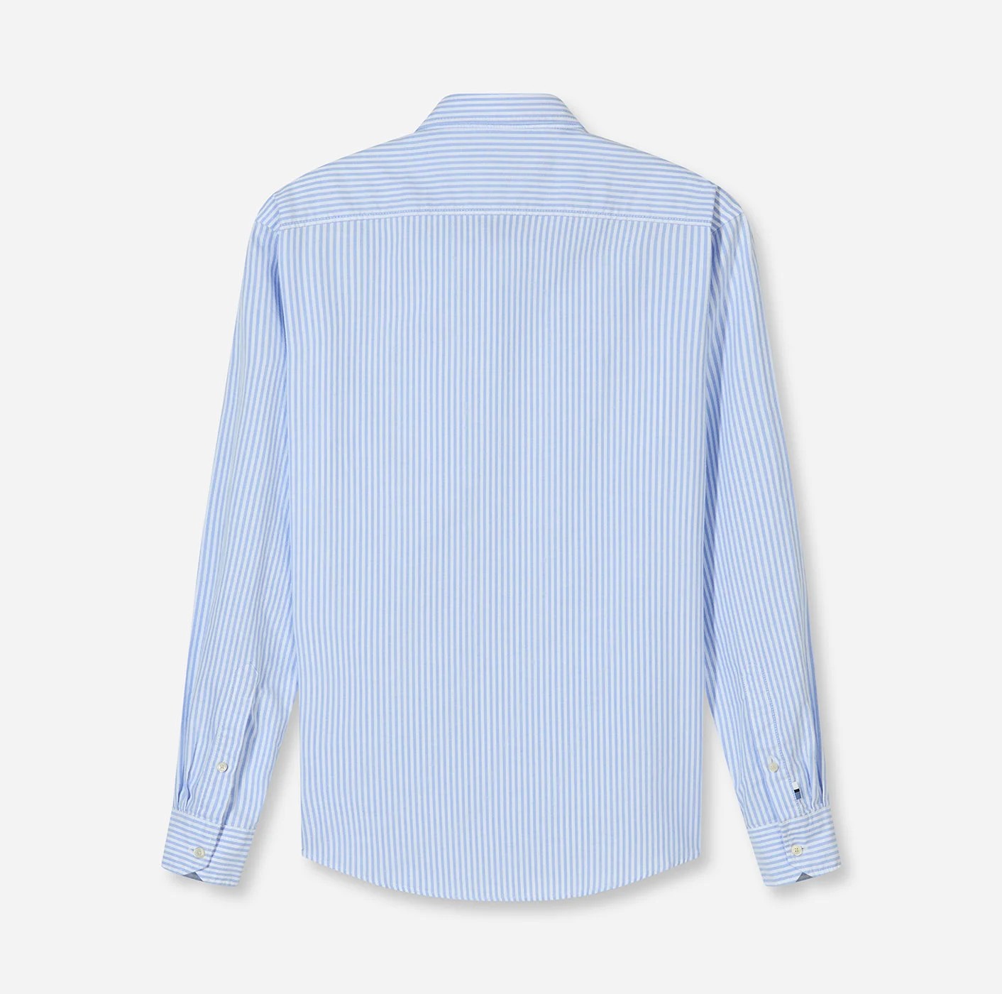 Casual Oxford cotton striped shirt with a button-down collar and a pocket with embroidery. Clean style, natural comfort.