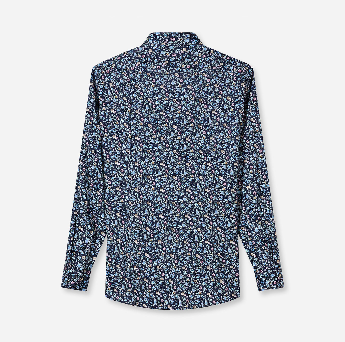 Long-sleeve shirt made of OEKO-TEX® STANDARD 100 certified twill cotton (95.0.3008 HTTI), with a multicolored floral print on a white background. Modern Fit, classic collar, and buttoned cuffs. Elegant and lively, perfect for creative business looks or semi-formal occasions.