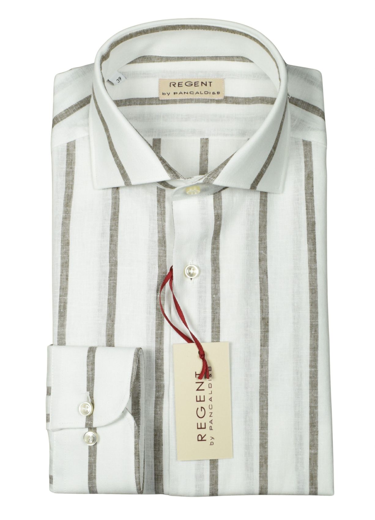 Pancaldi shirt in linen and cotton 55/45, slim fit with French collar. Brown striped variant on a white background, fresh and elegant. Ideal for refined summer looks, ceremonies, and business outfits.
