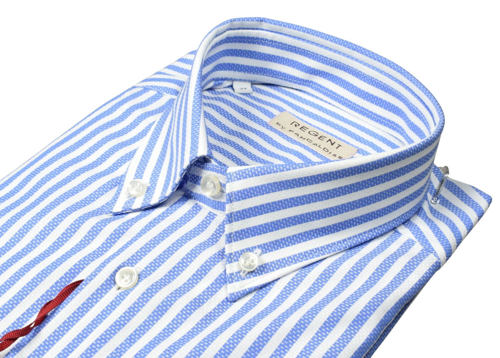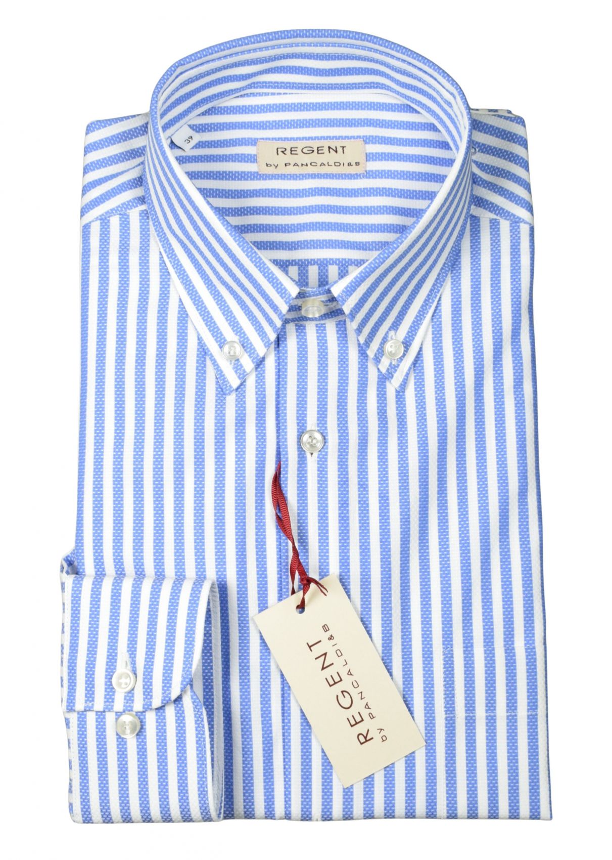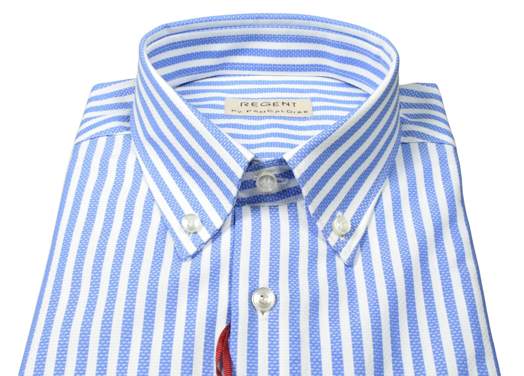 Pancaldi shirt in pure cotton with blue stripes and a button-down collar. Elegant, fresh, and impeccable in the tailoring details. Perfect for formal and business looks with a touch of contemporary style.